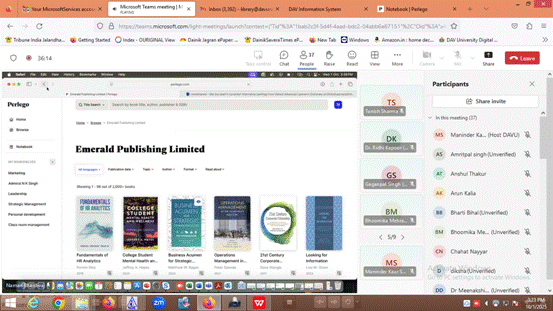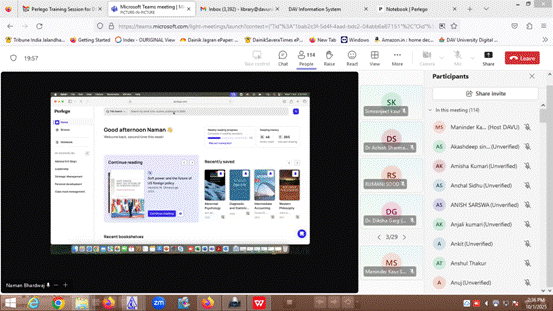 15. Online Training Session on Perlego: On October 1, 2025, an online training session on Perlego, an ebooks database, was held.The session was attended by a sizable number of instructors and students from every department and discipline. Ms. Maninder Kaur Sood, Incharge Knowledge Resource Center, oversaw the session, which was led by Mr. Naman Bhardwaj, Senior Training Specialist, CTS, Navi Mumbai. The attendees learnt how to access the platform, navigate the dashboard, understand features, and use a variety of study tools during the session. The specialist addressed all of the participants' questions during the final Q&A session.