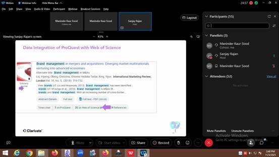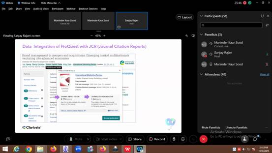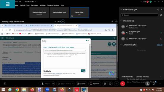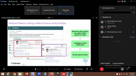 16. Online Training Session on ProQuest: An online training session on ‘Empowering Academic Success: Leveraging ProQuest Subscriptions Effectively’ was organinzed on 3rd Nov.2025. Many faculty members, research scholars, and postgraduate students attended the session. The session was taken by Mr. Sanjay Rajan, Sr. Customer Success Manager-APAC. He gave a demonstration of several ProQuest features and capabilities that can support users in their academic and research endeavors. The training specialist addressed all of the attendees' questions at the conclusion of the session. The workshop closed with a vote of appreciation from Ms. Maninder Kaur Sood, the host and Incharge Knowledge Resource Center, who thanked the attendees and the distinguished guest for making the program a success.